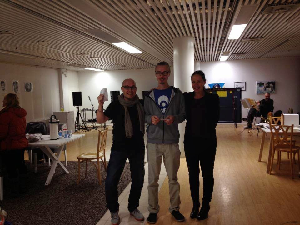 | Kuvassa POP Up ILO:n Pasi Nikkinen, taidekilpailun voittaja Marko Anttila, sekä Maria Ylitapio Osuuskauppa Arinasta. |